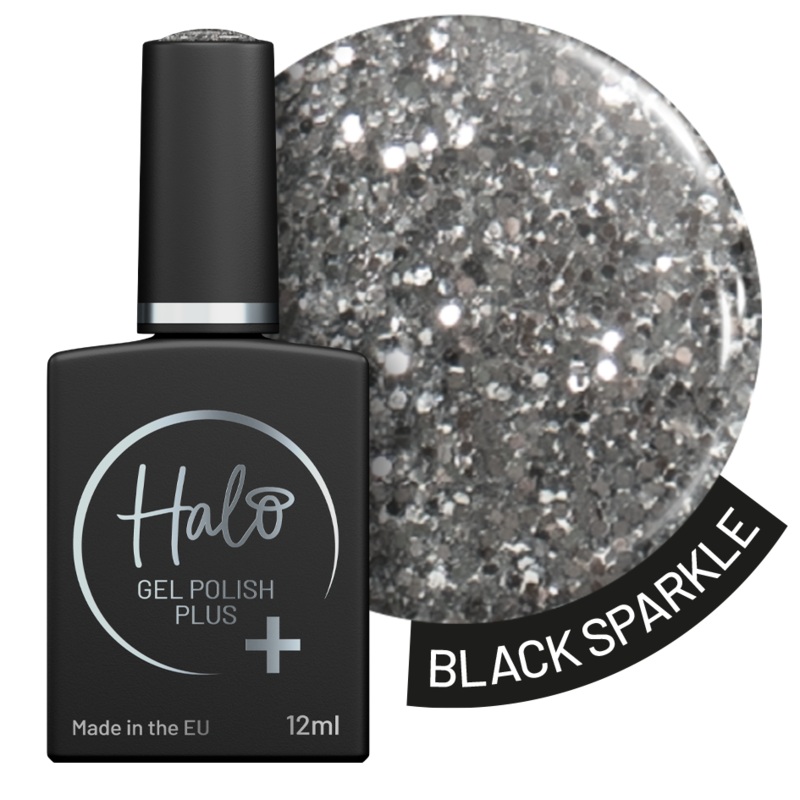 A deep black infused with shimmering glitter, creating a dazzling, multi-dimensional effect.