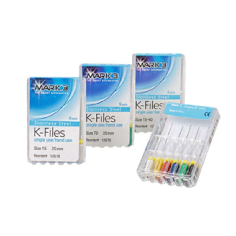 MARK3 K-Files are strong, stainless steel K-files, with color coded stoppers. A smooth tactile sense inside the canal during instrumentation. Available in 45 different sizes.Compares to: K-Files by SybronEndo, Miltex, JS Dental, Roydent, Premier and Diaden