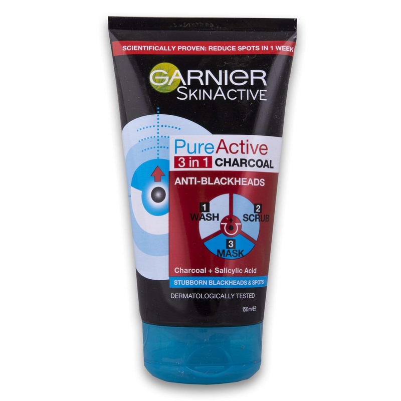 Brand: Garnier. Product Type: Wash, Scrub, Mask. Key Ingredients: Charcoal, Salicylic Acid. Volume: 150ml. Formulation: Dermatologically tested. Allergies/Warnings: For external use only.